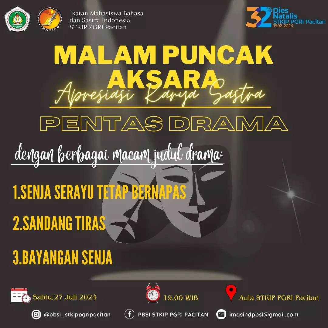 [ AKSARA 2024 ] Apresiasi Karya Sastra ———————————– Dalam rangka Dies Natalis ke-32 STKIP PGRI Pacitan dan hari sastra Indonesia 2024, HMP PBSI mempersembahkan Aksara 2024. Salah satu rangkaiannya adalah lomba berkaitan dengan sastra Indonesia. Daftarkan diri anda di Aneka Lomba-Lomba Aksara: 1. Resensi Buku 2. Mendongeng 3. Menulis Cerita Anak Link Pendaftaran, Pengumpulan, Juklak …