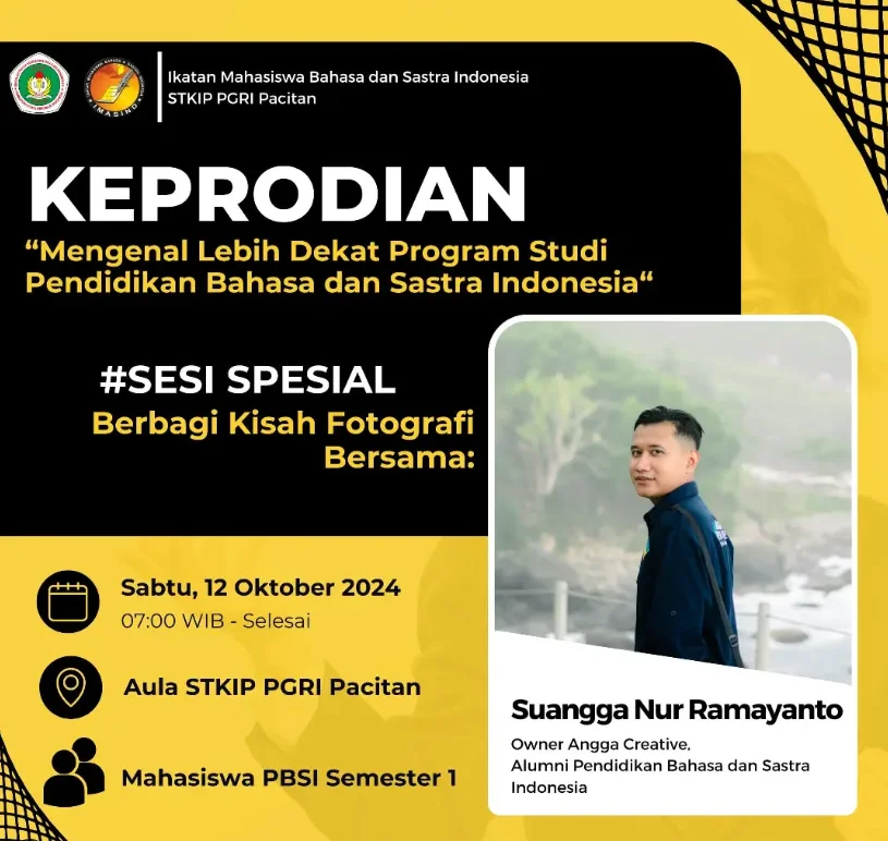 Dalam rangka menyambut mahasiswa baru prodi Pendidikan Bahasa dan Sastra Indonesia tahun ajaran 2024/2025. Ikatan Mahasiswa Bahasa dan Sastra Indonesia mengadakan acara Keprodian dirangkaikan dengan sesi spesial Berbagi Kisah Fotografi bersama Suangga Nur Ramayanto. Yang akan diselenggarakan pada: