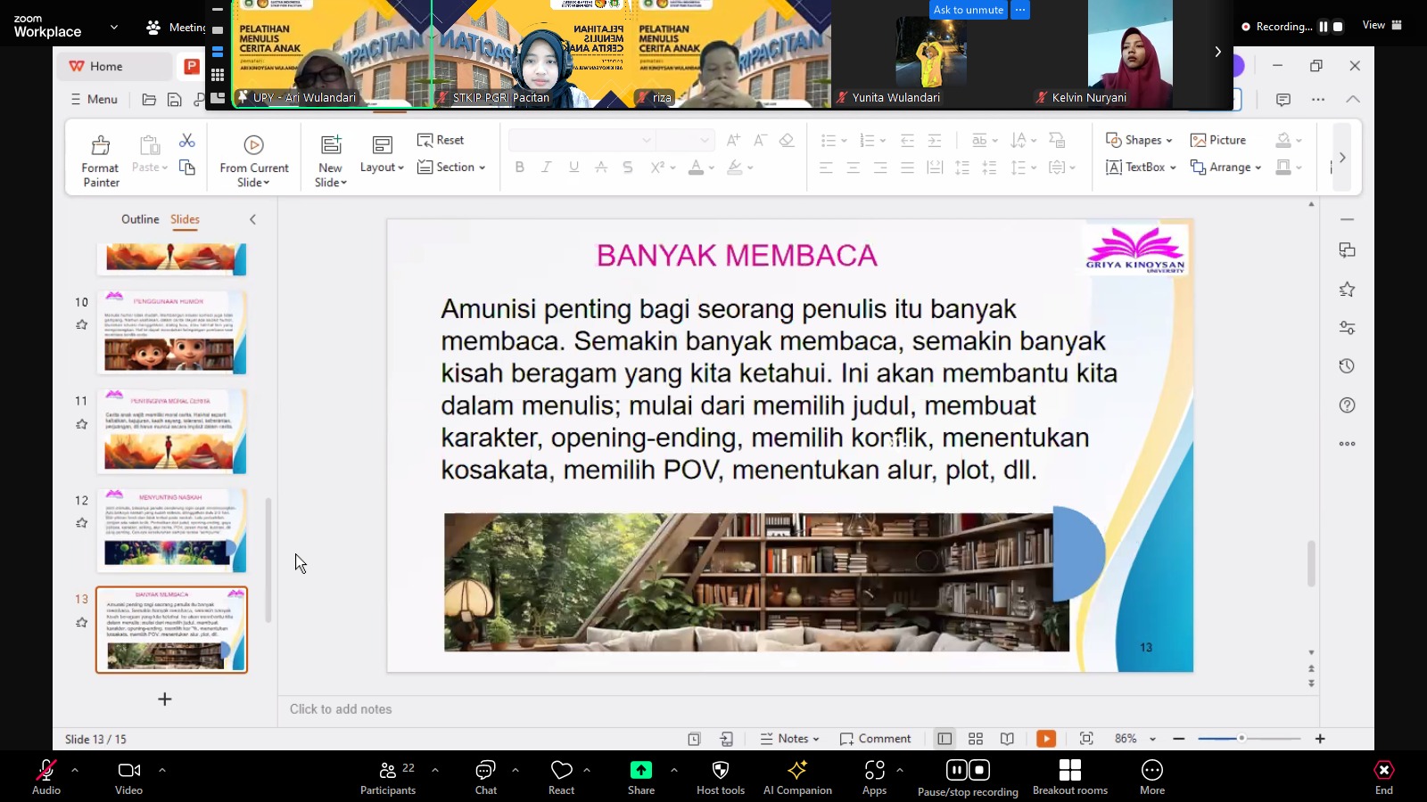 Pacitan, 7 Agustus 2024 – Program Studi Pendidikan Bahasa dan Sastra Indonesia (PBSI) STKIP PGRI Pacitan sukses melaksanakan pelatihan menulis cerita anak yang berlangsung secara daring melalui platform Zoom. Kegiatan ini menghadirkan dosen berkompeten dari Universitas PGRI Yogyakarta (UPY), Dr. Ari Kinoysan Wulandari, S.S., M.A. yang dikenal sebagai pakar dalam bidang penulisan anak.